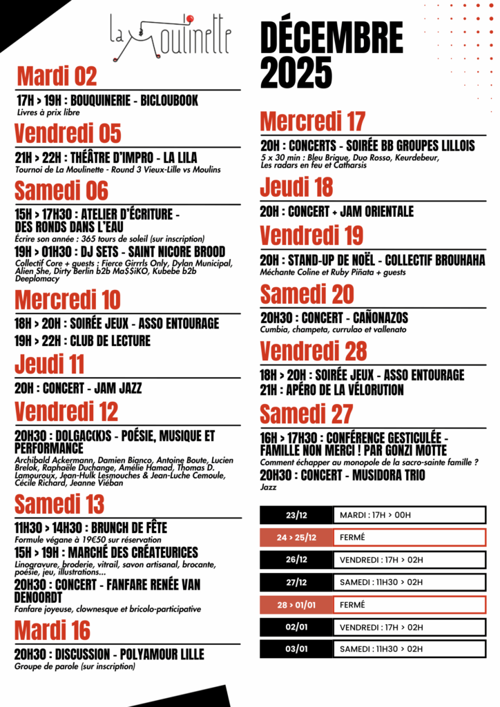 La Moulinette est enfin un espace à partager dans un esprit solidaire, familial, festif, réflexif, engagé, joueur, enjôleur… Selon les heures !